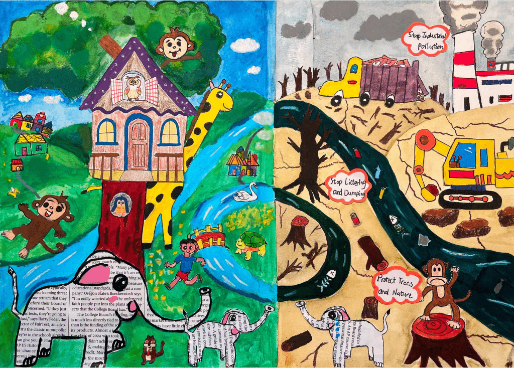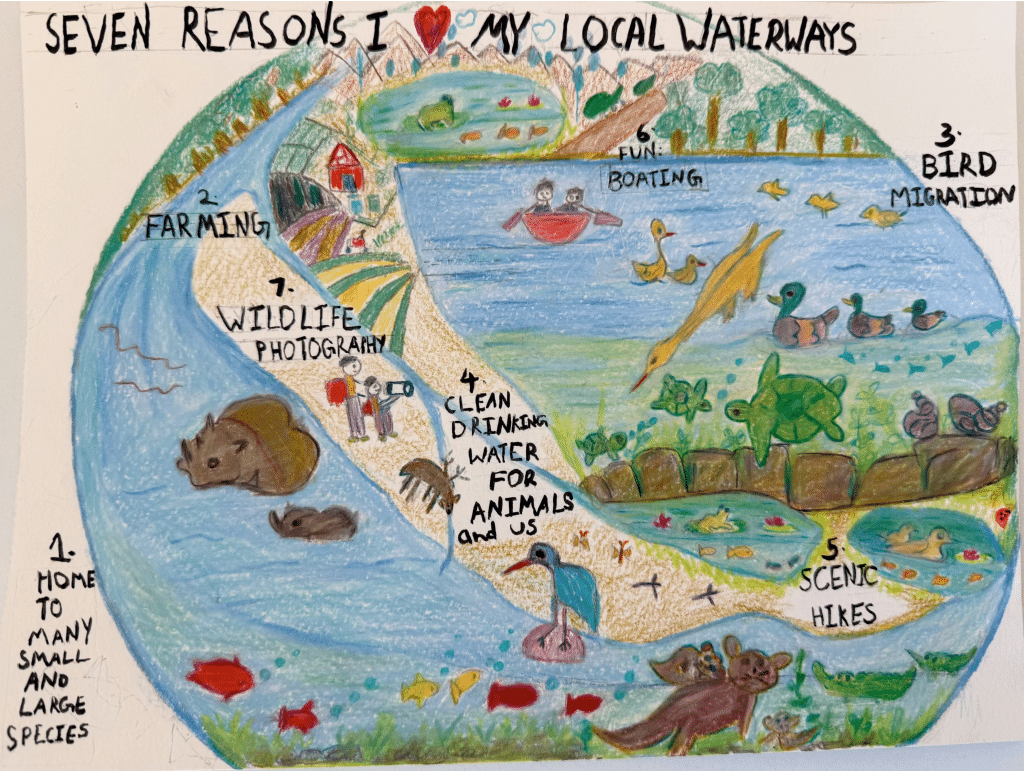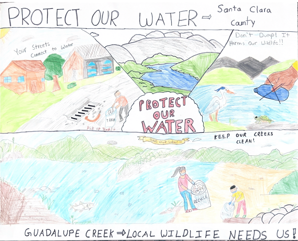 The Watershed Watch Campaign invited Santa Clara County K-8 students to create, inform and inspire through the Watershed Watch Earth Day Poster Challenge. The Challenge offered cash prizes for first and second place winners in three age brackets: K-2nd, 3rd-5th and 6th-8th grades. To create their artwork, students responded to one of two prompts: “How can you prevent water pollution?” or “What do you love about our local waterways (creeks, rivers, lakes)?” Posters were judged by Santa Clara Valley Urban Runoff Pollution Prevention Program (SCVURPPP) members on the criteria of originality, clarity and expression of theme.